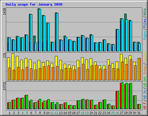 | Day | Hits | Files | Pages | Visits | Sites | kB F | kB In | kB Out | ||||||||