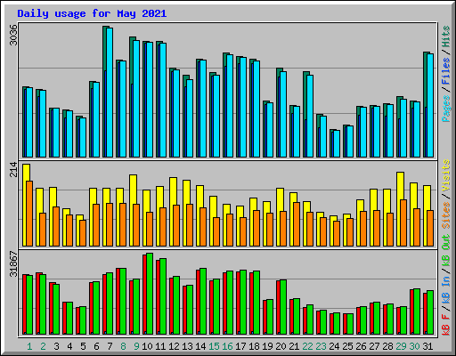 | Day | Hits | Files | Pages | Visits | Sites | kB F | kB In | kB Out | ||||||||