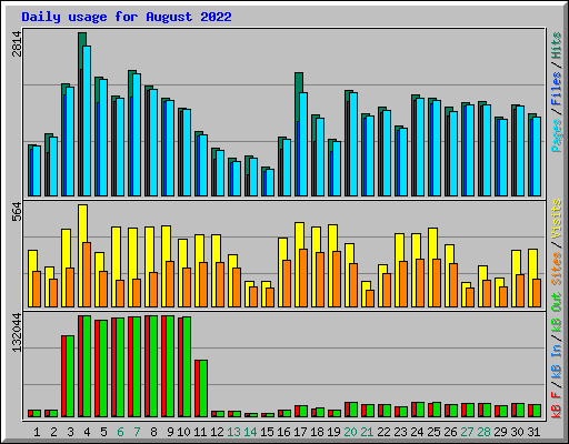 | Day | Hits | Files | Pages | Visits | Sites | kB F | kB In | kB Out | ||||||||