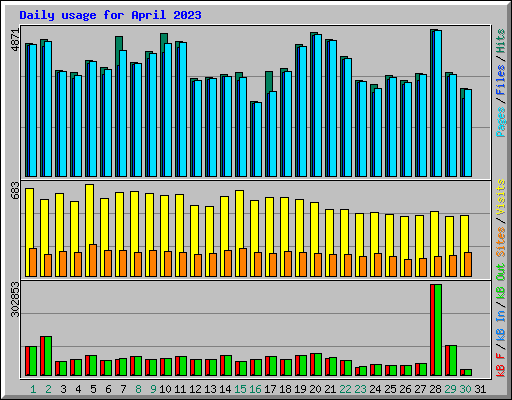 | Day | Hits | Files | Pages | Visits | Sites | kB F | kB In | kB Out | ||||||||